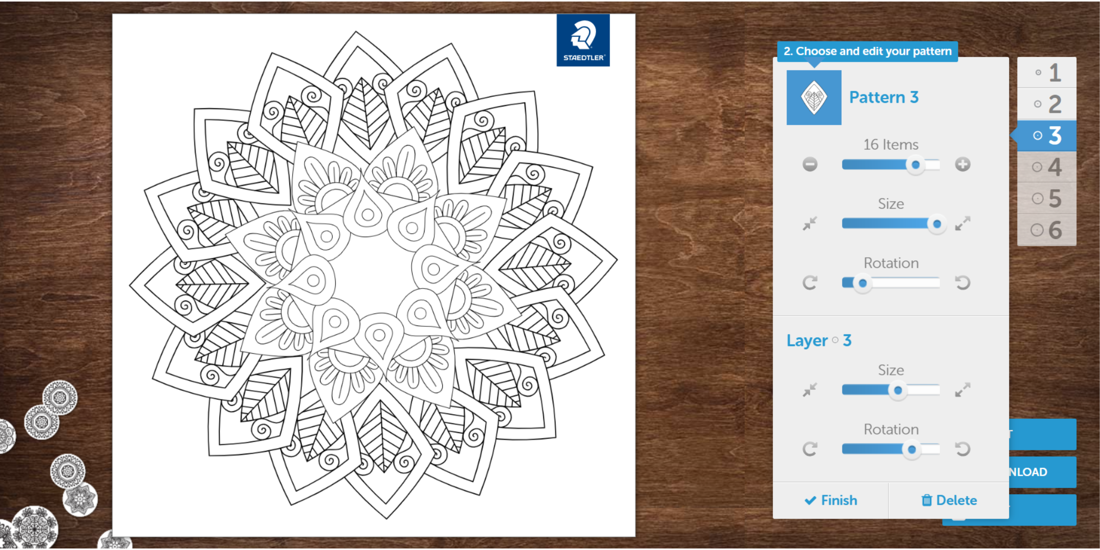 Mandalas derive from Buddhist and Hindu cultures in which for centuries they have gained currency as images for meditation. A mandala pattern is mostly round, geometrically arranged around a centre point. It is perfect for expressing creativity, where enjoyment in colouring brings a certain kind of fulfilment. Here on our page you’ll find some complimentary colouring patterns to print out and colour in. In addition, you can use our Mandala Creator to produce your own colouring patterns or be inspired by different artists.