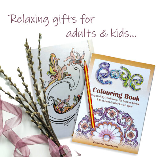 - Triangular jumbo “Rainbow” coloured pencil + A colouring book with traditional Sri Lankan motifs by Sri Lankan Artist & Lecturer Erandathie Damunupola