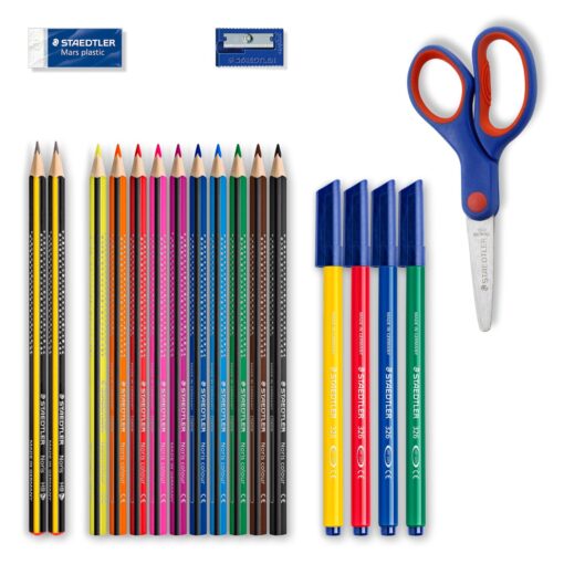 Blistercard containing 10 coloured pencils in assorted colours, 2 graphite pencils, 4 fibre-tip pens in assorted colours, 1 eraser, 1 sharpener and 1 pair of hobby scissors.