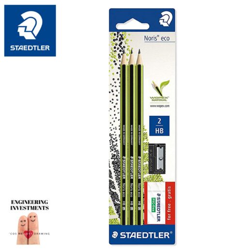 - 3 Green and Black Noris Eco graphite writing and drawing pencils in HB, 1 single-hole sharpener 510 50 and black Rasoplast 526 B40-9 eraser