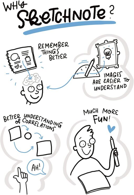 - Starter set with step-by-step instructions for sketch notes at school (combination of symbols and words, easy to understand, notice, share, symbols from the basic shapes square, triangle, circle, lines).